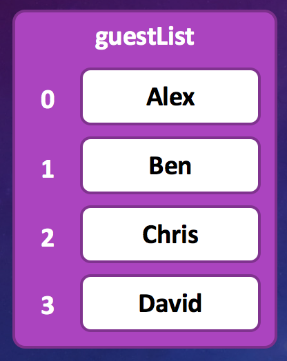 console.log(fruits[0]); // Prints "Apple"One thing you will notice from the above code is that the number ‘0’ appears in the square brackets. Most programming languages use zero indexing when accessing items in an array or list and this means that the first item in the list has index 0. This means that if you wanted to access all 4 members of the array of fruits, you would use values 0, 1, 2 and 3. As shown below;