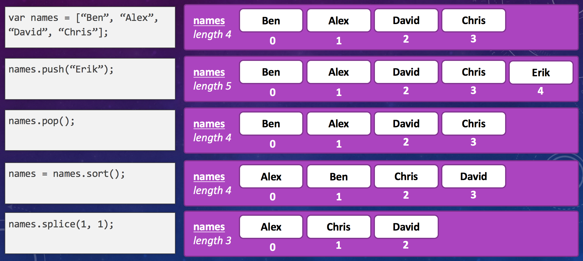 The following chart shows some of the most useful properties and methods you can use to interact with arrays. For a full list of methods you can call on an array, see the methods section of the Mozilla Technical Documentation on Arrays.